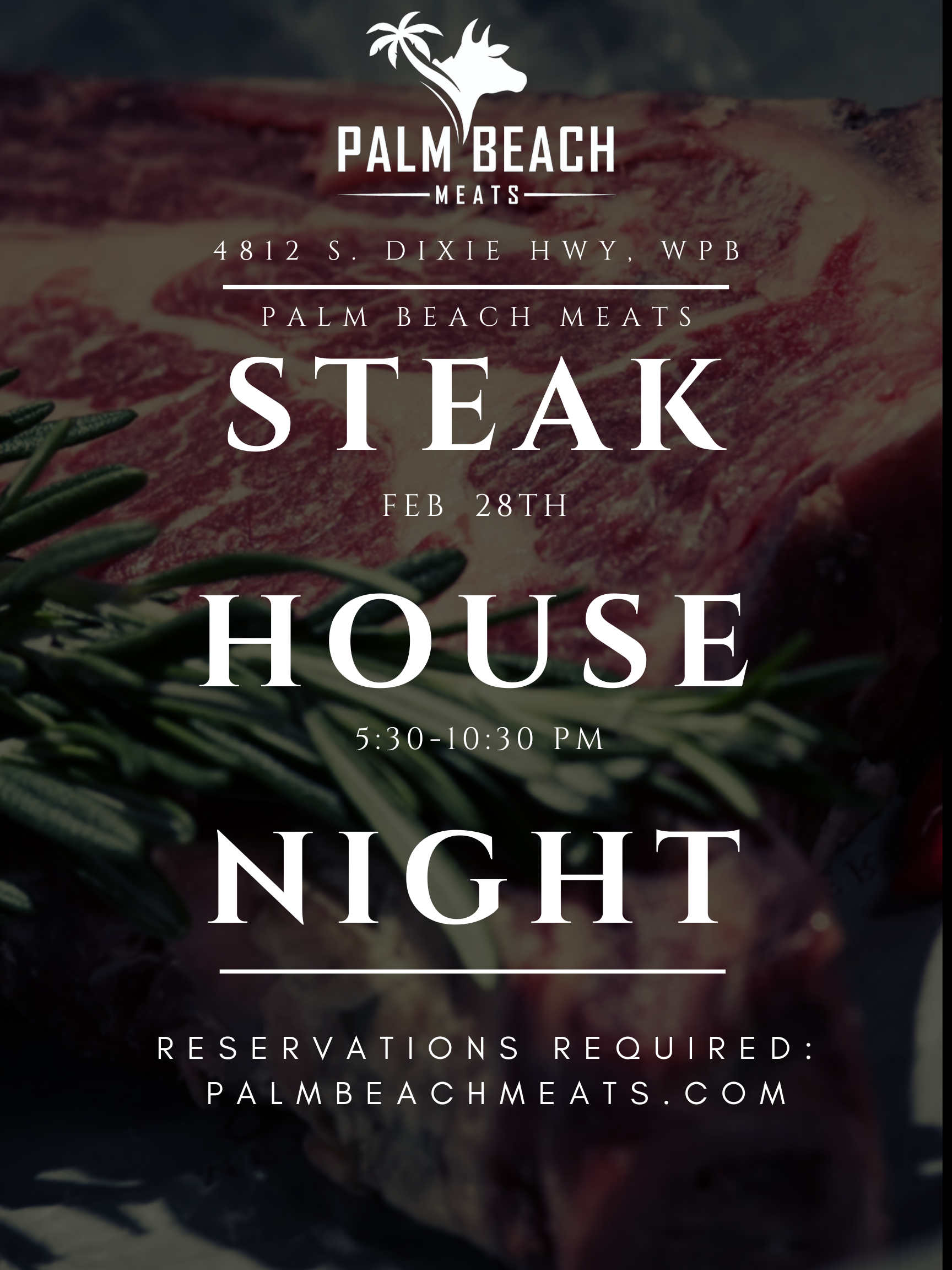 Join us for Steak House Night at Palm Beach Meats, featuring an exclusive Wagyu-only menu that changes seasonally. Based on the traditional steakhouse à la carte experience, Chef Daniel Ramos offers a unique twist, focusing solely on the rich flavors of Wagyu beef. He carefully sources local ingredients and herbs, along with fresh veggies from his farm, to elevate each dish. Come indulge in this unforgettable dining experience today!