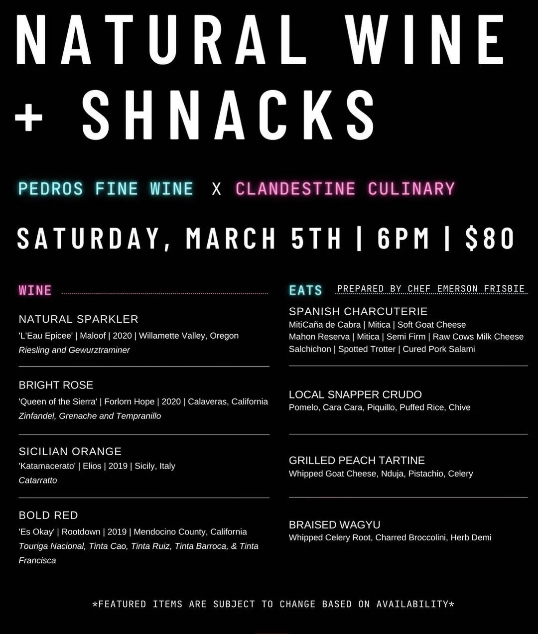 Clandestine Culinary and Pedro’s Fine Wines team up to bring you this special evening of Natural Wine and Shnacks!
