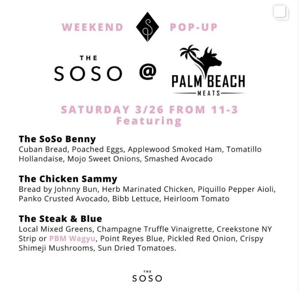 The SoSo Cafe Pop-Up Lunch Saturday, March 26, 2022 11:00 AM 3:00 PM Palm Beach Meats 4812 South Dixie Highway West Palm Beach, FL, 33405 United States (map) Google Calendar ICS Join us as we welcome our neighbors from the SoSo cafe take over the PBM kitchen to give the community a taste of what to expect from their new cafe opening soon!